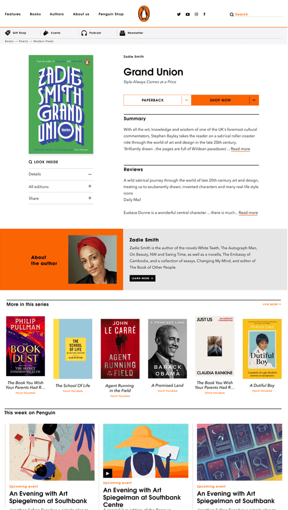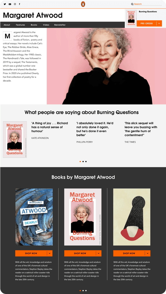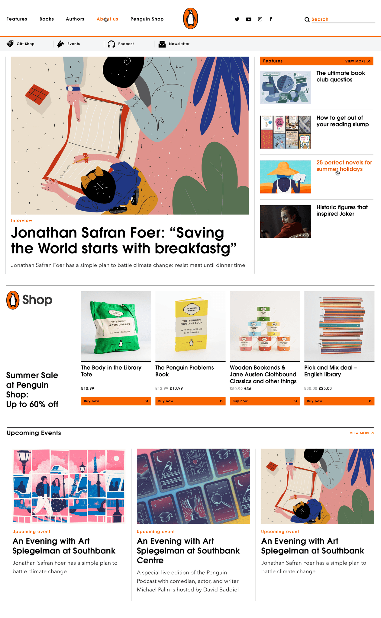 Penguin's website used to host press releases, corporate content, and a database of books. As a part of the newly formed Creative and Product teams, I was tasked with relaunching the site as Penguin's own media platform. I worked across functions to workshop and design it.
